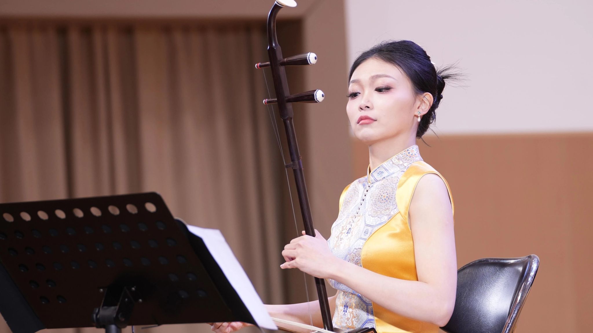 随后,郑博尹老师用无千斤二胡演奏了《夜静箫声》,运用仿洞箫的演奏技法,营造出悠远静谧的音乐意境,引人入胜。