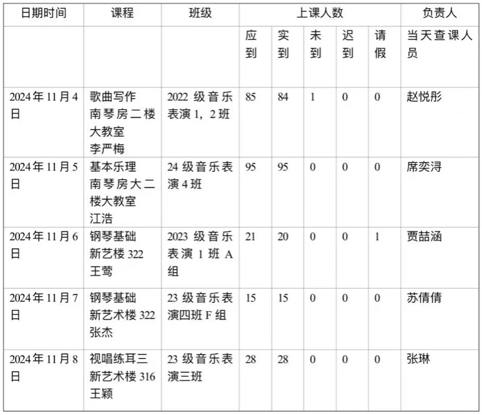 本周,音乐学院团委学习部的查课工作正常进行,现将河南大学音乐学院本周查课结果进行公布和总结: