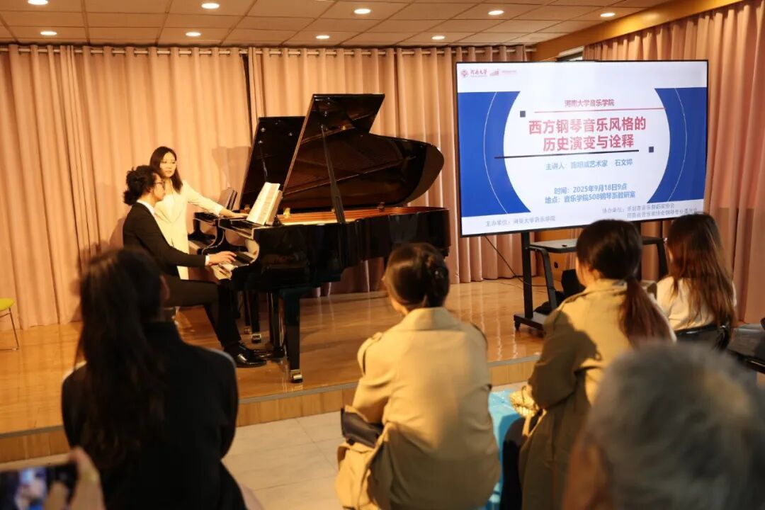 9月18日上午,河南大学音乐学院新一期“至善论坛”之《西方钢琴音乐风格的历史演变与诠释》讲座公开课在钢琴系教研室举行,钢琴家石文婷博士担任本期主讲嘉宾,音乐学院钢琴系主任潘伟教授主持讲座。