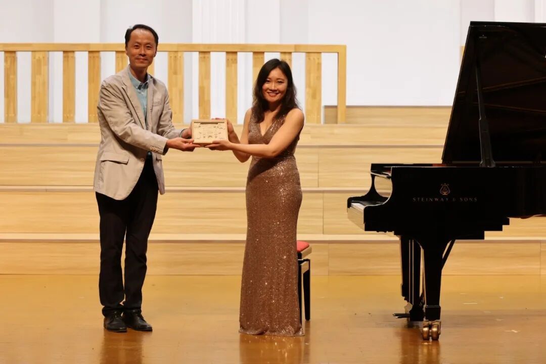 河南大学音乐学院副院长王新代表学院向石文婷赠送纪念品,感谢她为河南大学音乐学院青年学子树立的学习榜样,以及她以自己的学习成果回报祖国、回报家乡的爱国情怀。两份荣誉不仅是对钢琴家石文婷艺术成就的充分肯定,更是对她多年来在钢琴演奏领域持续耕耘、在艺术道路上不断追求卓越的真诚致敬。