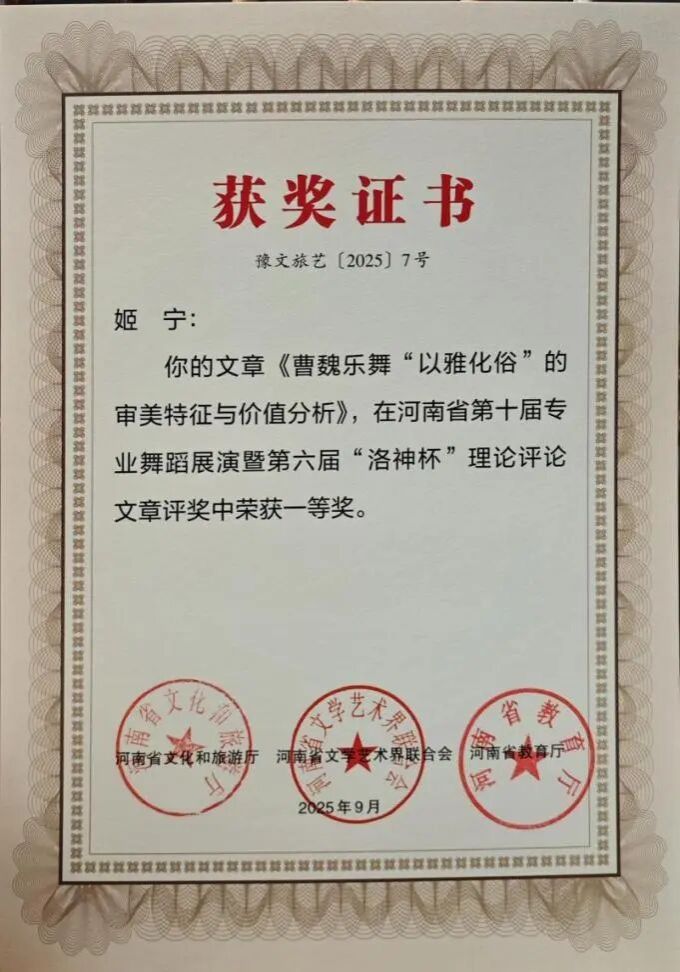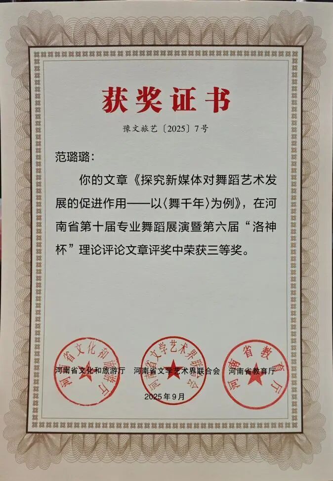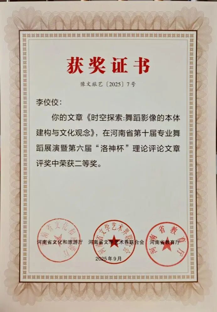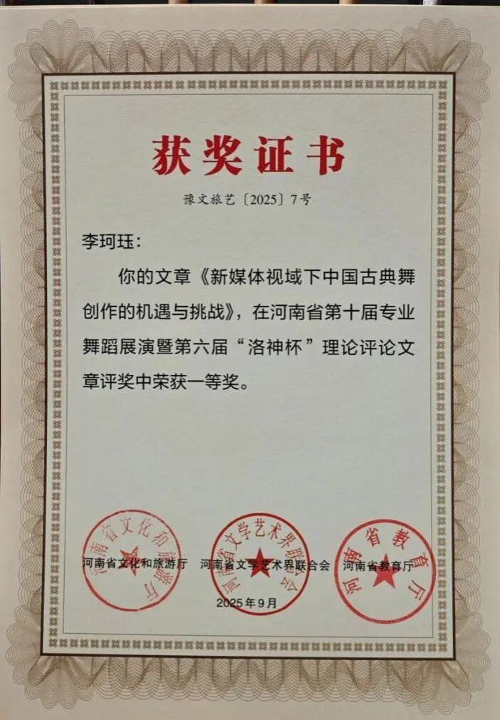 此次双科奖项的获得,是我院舞蹈系多年来坚守“创作与科研并重、实践与理论双驱”的丰硕成果。未来,舞蹈系将以此为新起点,持续发挥专业优势,在推动学院舞蹈教育高质量发展的进程中主动担当,在传承创新中原优秀传统文化的道路上稳步前行,为行业培养更多高素质人才,贡献更多富有感染力与文化底蕴的艺术成果。