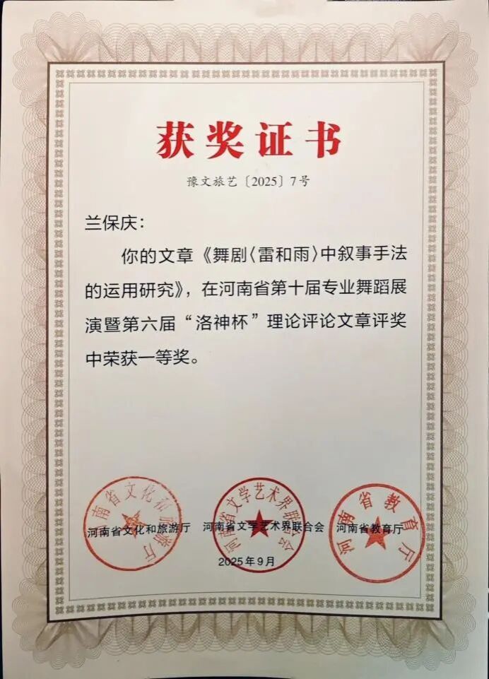 舞蹈理论评论方面包括一等奖3项:论文《曹魏乐舞“以雅化俗”的审美特征与价值分析》《新媒体视域下中国古典舞创作的机遇与挑战》《舞剧〈雷和雨〉中叙事手法的运用研究》;