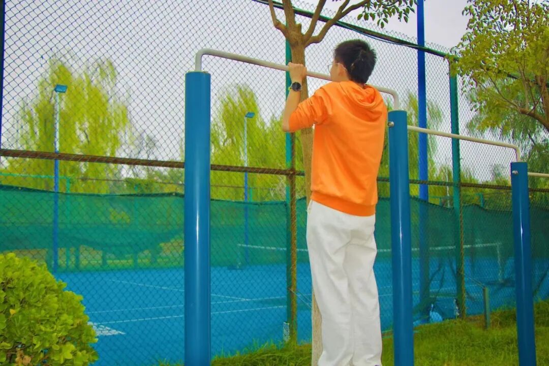单杠上,男子引体向上尽显力量;