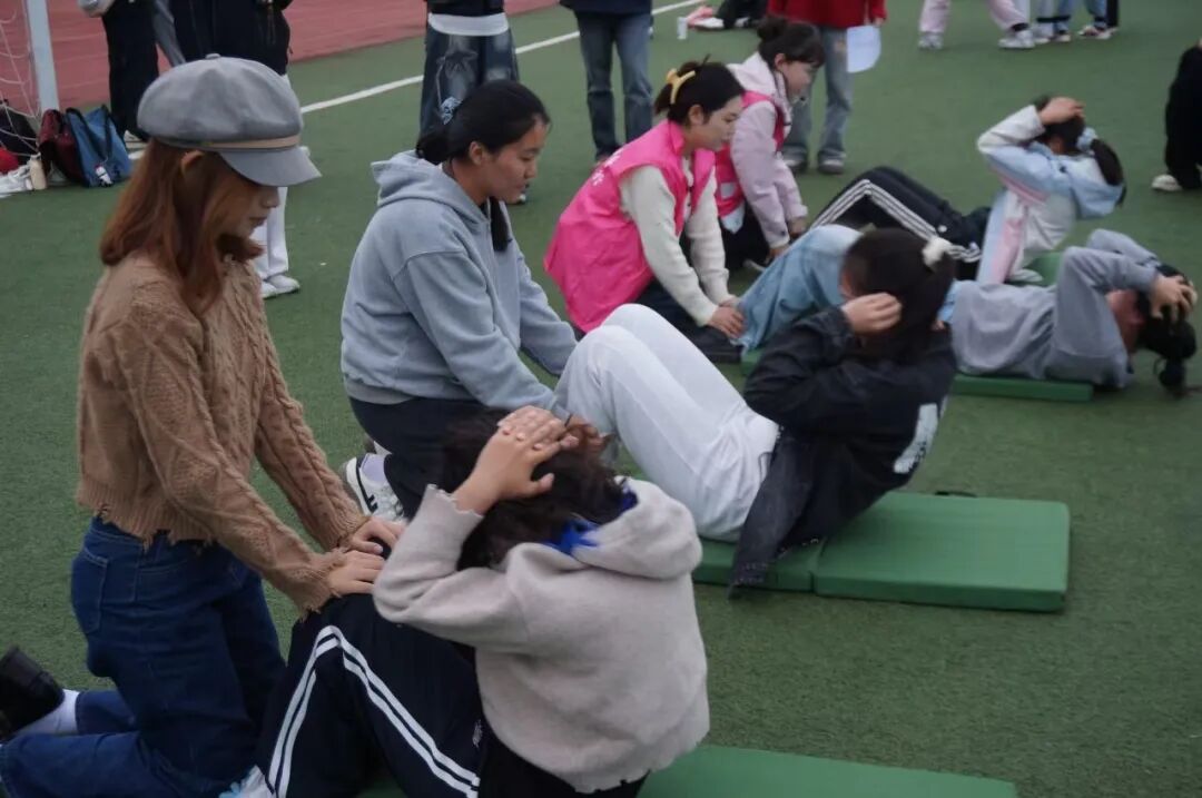 垫子上,女子仰卧起坐比拼耐力。