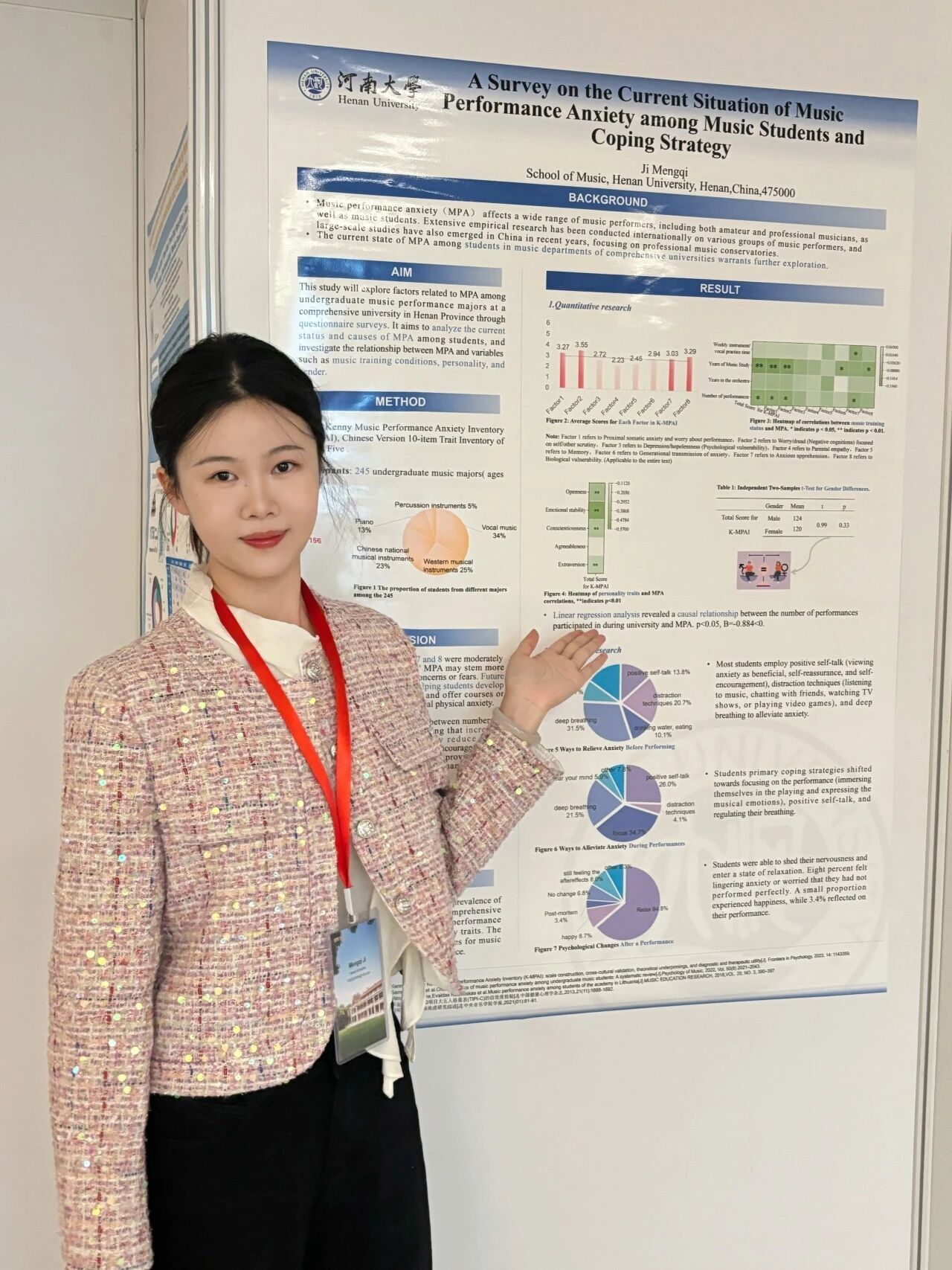 姬孟琪,我院2024级艺术学硕士研究生(音乐教育学方向),在会议中报告的题目是《A Survey on the Current Situation of Music Performance Anxiety among Music Students and Coping Strategy》。旨在研究音乐专业大学生表演焦虑的现状与成因,分析音乐表演焦虑与音乐训练状况、人格、性别等变量之间的关系。对河南省某高校的245名音乐专业本科生的音乐表演焦虑现状展开问卷调查,测量工具采用Kenny音乐表演焦虑量表(K-MPAI)和中国版10项目大五人格量表(TIPI10)。描述性数据结果发现,大学生音乐表演焦虑的普遍性较高,其中K-MPAI量表第1、2、7、8维度得分较高,表明学生的音乐表演焦虑可能更多源于个人心理问题或恐惧。相关性分析结果表明,在音乐训练状况上,表演焦虑和学习音乐年限、大学期间参加表演次数显著性负相关;在人格上,表演焦虑和外向性(外向的、热情的)、尽责性(可靠的、自律的)、情绪稳定性(不易焦虑、冷静的)、开放性(乐于冒险、愿意接触新事物的)四个人格维度显著性负相关,与宜人性不存在显著相关。此外,研究还发现不同性别的表演焦虑差异性不大。该研究为音乐专业的表演实践和教育实践提供了启示和意见。