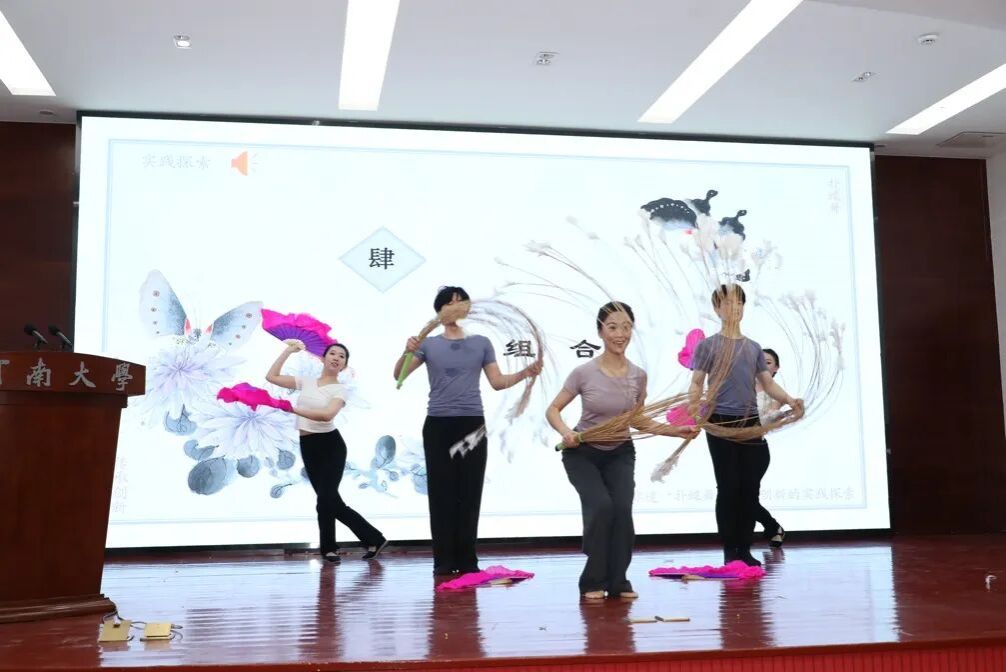 河南大学音乐学院舞蹈编导专硕研究生贾溯宁、司雨、陈昱彤主讲的《鱼灯豫韵——河南传统民间舞蹈鱼灯舞的道具配合性训练》,以河南民间传说为背景,生动讲述鱼灯舞的起源与风格,巧妙融合扇子与鱼灯,感受发力逻辑与运动轨迹,赋予“水”与“游鱼”的意象表达。团队创新探索了道具手位与握法,结合传统阵型,强化道具间的联动配合,具象呈现“游鱼戏水”的灵动场景。