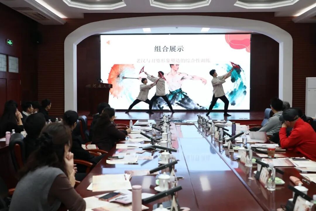 河南大学音乐学院舞蹈编导专业硕士研究生习晓叶、王潇贤、吴琼、李晨主讲的《身体基因的辨识与赓续——扑伞舞中老汉与丑婆形象塑造的综合性训练》以文献研读与田野调查为基,提取了“老汉”与“丑婆”的典型动作元素,并运用火伞、笊篱等传统道具,还原老汉“扛伞步”“三炉香”及丑婆“整装系列”等特色动律,生动塑造出两个性格鲜明的角色形象。
