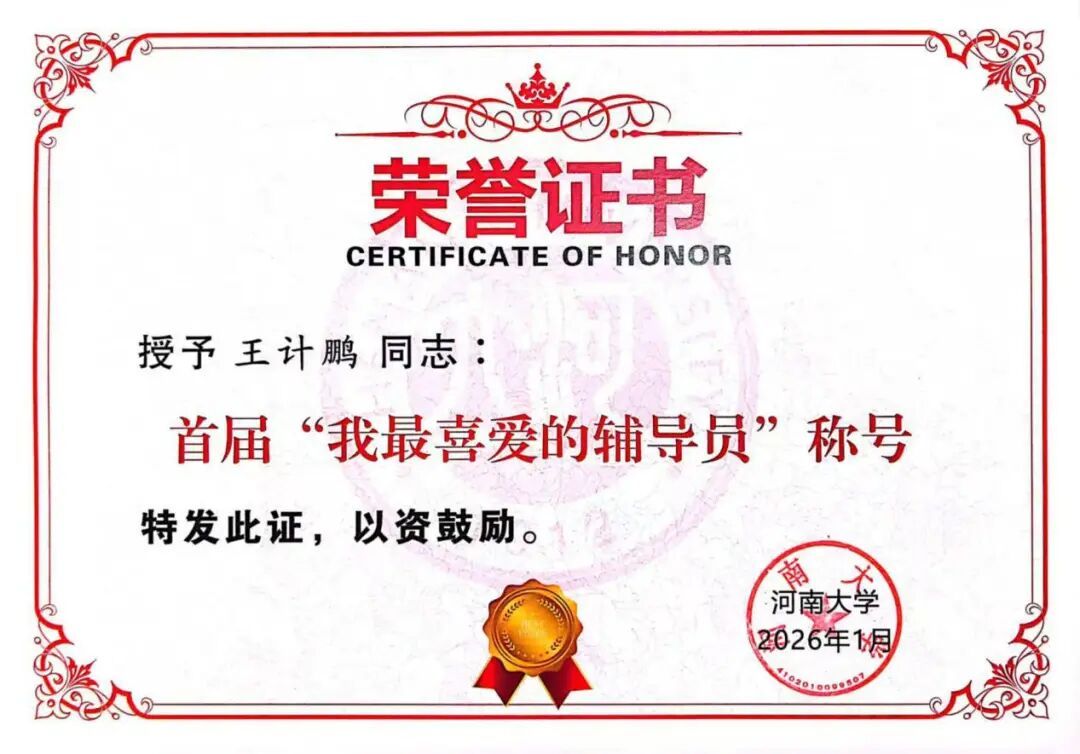 3月25日下午,河南大学在金明校区行政楼召开2026年度学生工作会议。会上对首届“我最喜爱的辅导员”获奖者进行了表彰。我院辅导员王计鹏凭借扎实的工作实绩与深厚的育人情怀,在激烈角逐中脱颖而出,荣获校级“我最喜爱的辅导员”称号。