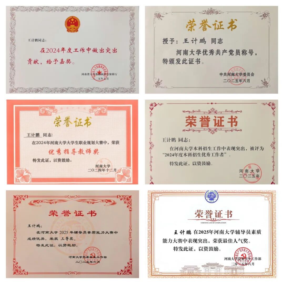 在王计鹏的精心指导与严格要求下,他所带的2023级实现了学业、素质、创新的全面突破。从2025年5月的校级二等奖,到6月的一等奖,再到9月荣获中国国际大学生创新大赛河南赛区三等奖,他指导的费雪儿、冯笑涵同学实现了赛事成绩的“三级跳”,极大地提升了学生的创新精神和实践能力;在他的精心带领下,整个2023级展现出积极向上、团结奋进的良好风貌,荣获2024-2025学年河南大学“优秀年级” 荣誉称号。这面沉甸甸的集体荣誉,是对他工作成效的最高肯定,也是他深受学生爱戴的最直观体现;所带支部凝聚力强,学生党员在各类活动中发挥先锋模范作用;此外,他还参与并结项河南大学社会科学类横向课题一项,开封市哲社科课题3项。其中主持课题《文化强国战略背景下关于非遗文化豫剧的传承发展研究—以开封祥符调为例》获2025年度开封市哲社科调研课题二等奖,将科研成果转化为育人资源。